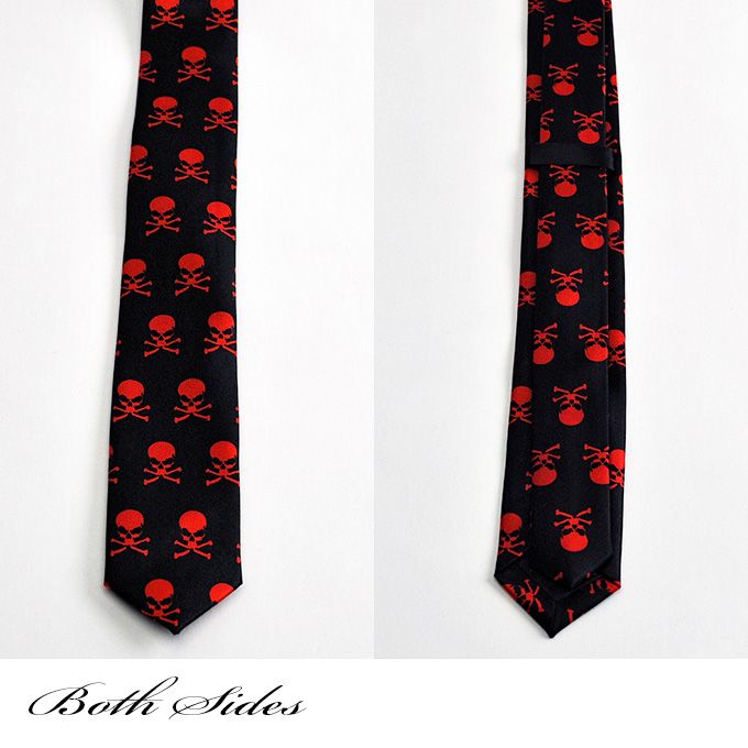 サイズ・素材【素材】 ポリエステル100% 【サイズ】 大剣5.5cm 全長:141cm 【カラー】生地:ブラックart necktie ブラックサテン生地にレッドのスカルトを散らしたお洒落デザインでロックっぽいデザイン。